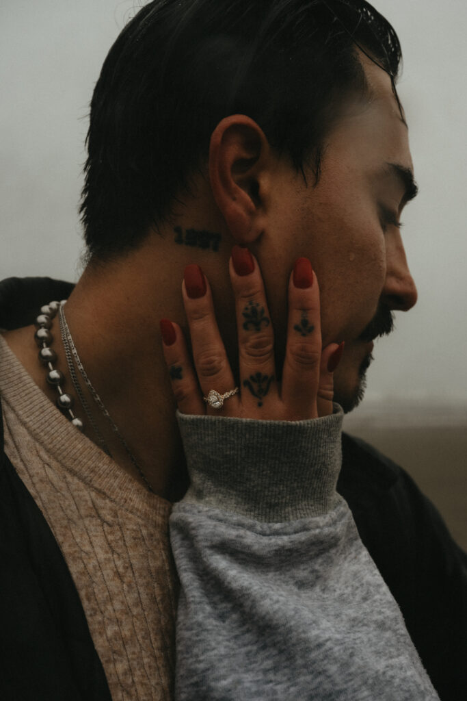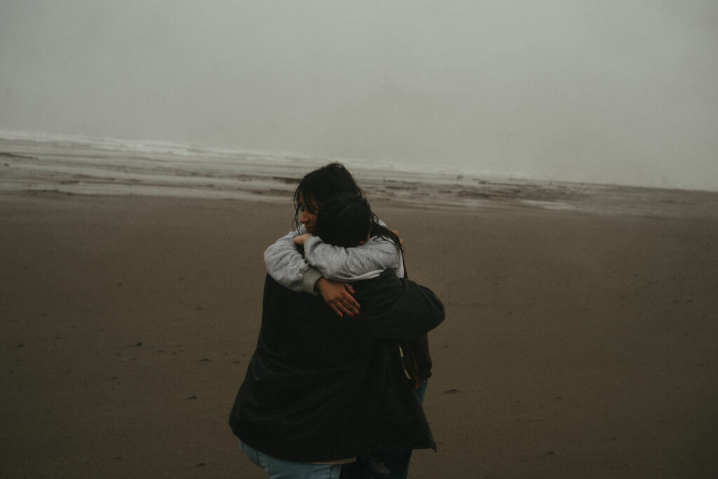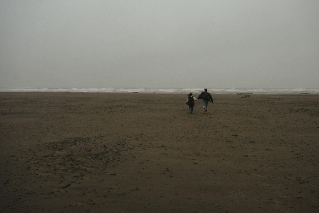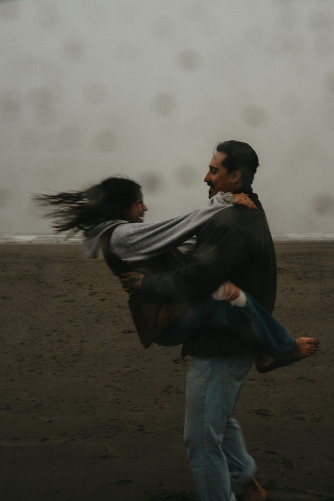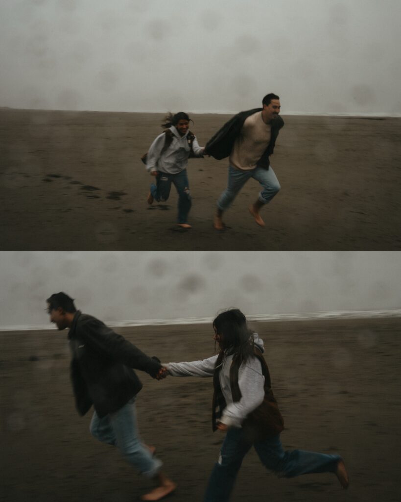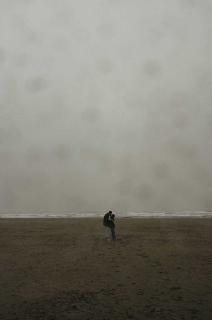 Hycell and Jacob’s couples session on the Oregon Coast turned into something even more special than either of us expected. The morning started with steady rain pouring down, the kind that soaks you within minutes. But honestly, it made everything feel even more romantic. The misty coastline, the waves crashing in the background, and the two of them just laughing through the rain.